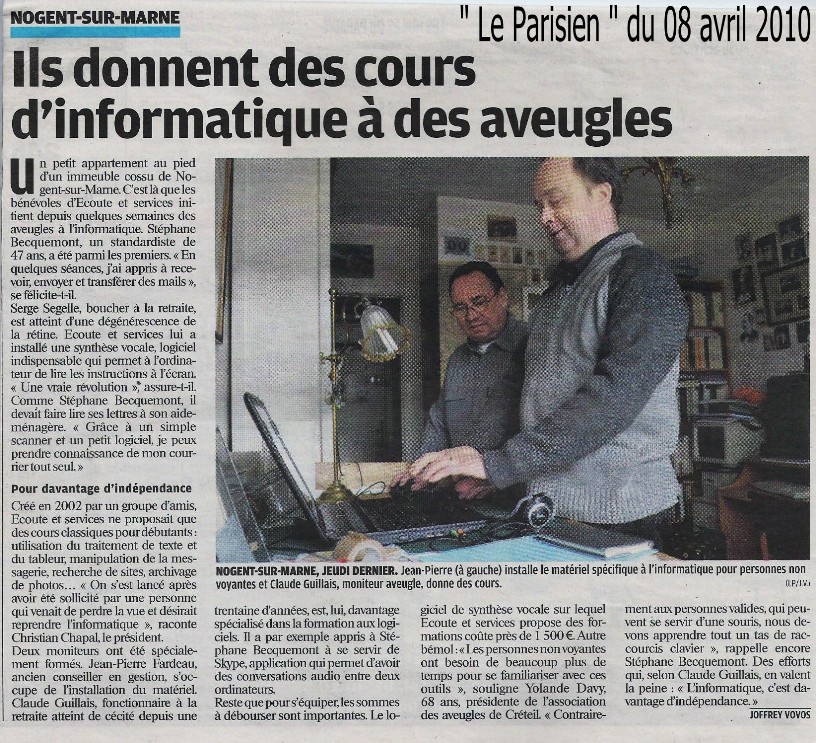 Initiation et perfectionnement en informatique pour les non-voyants. Ces cours s'effectuent à distance avec du matériel adapté par des moniteurs bénévoles